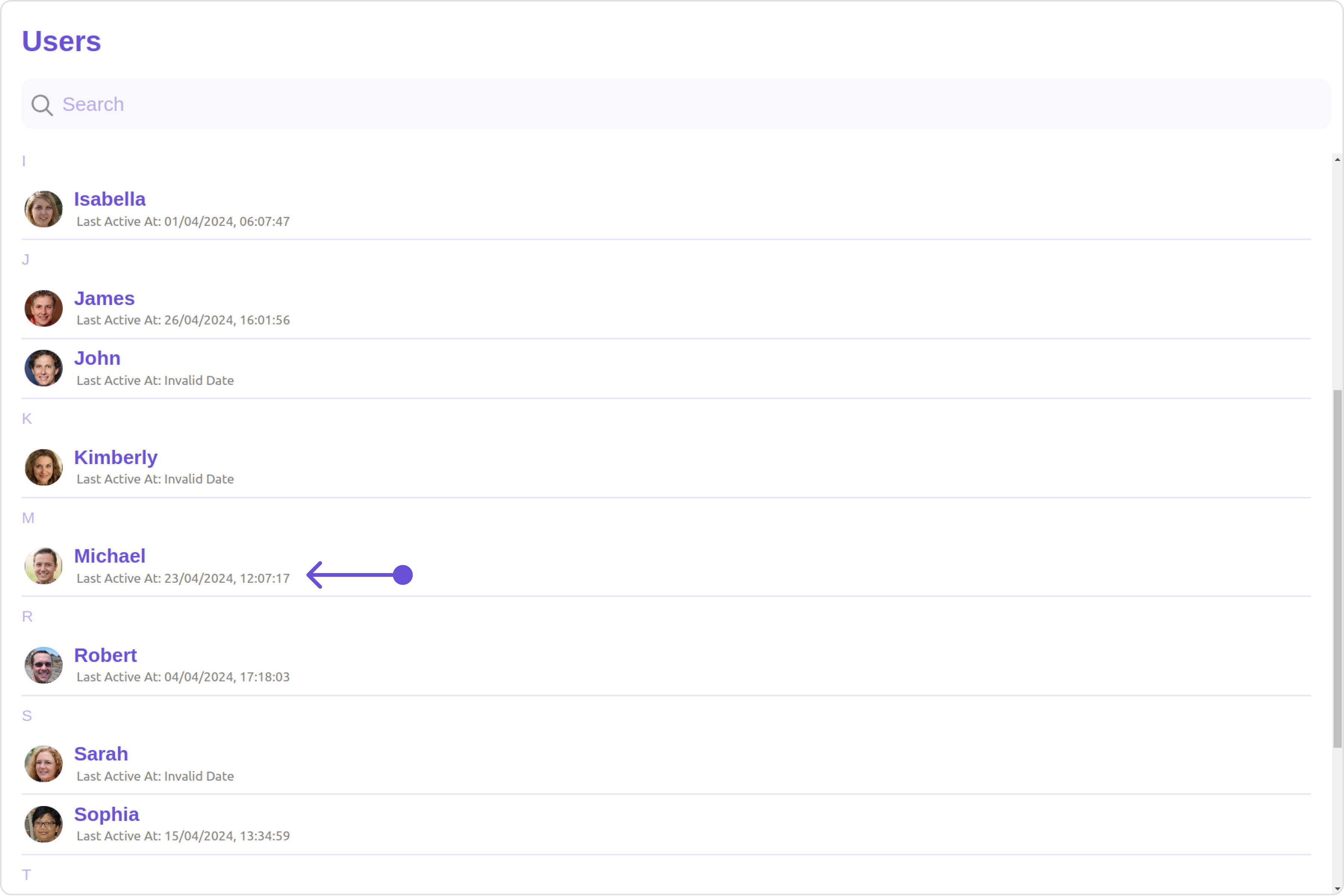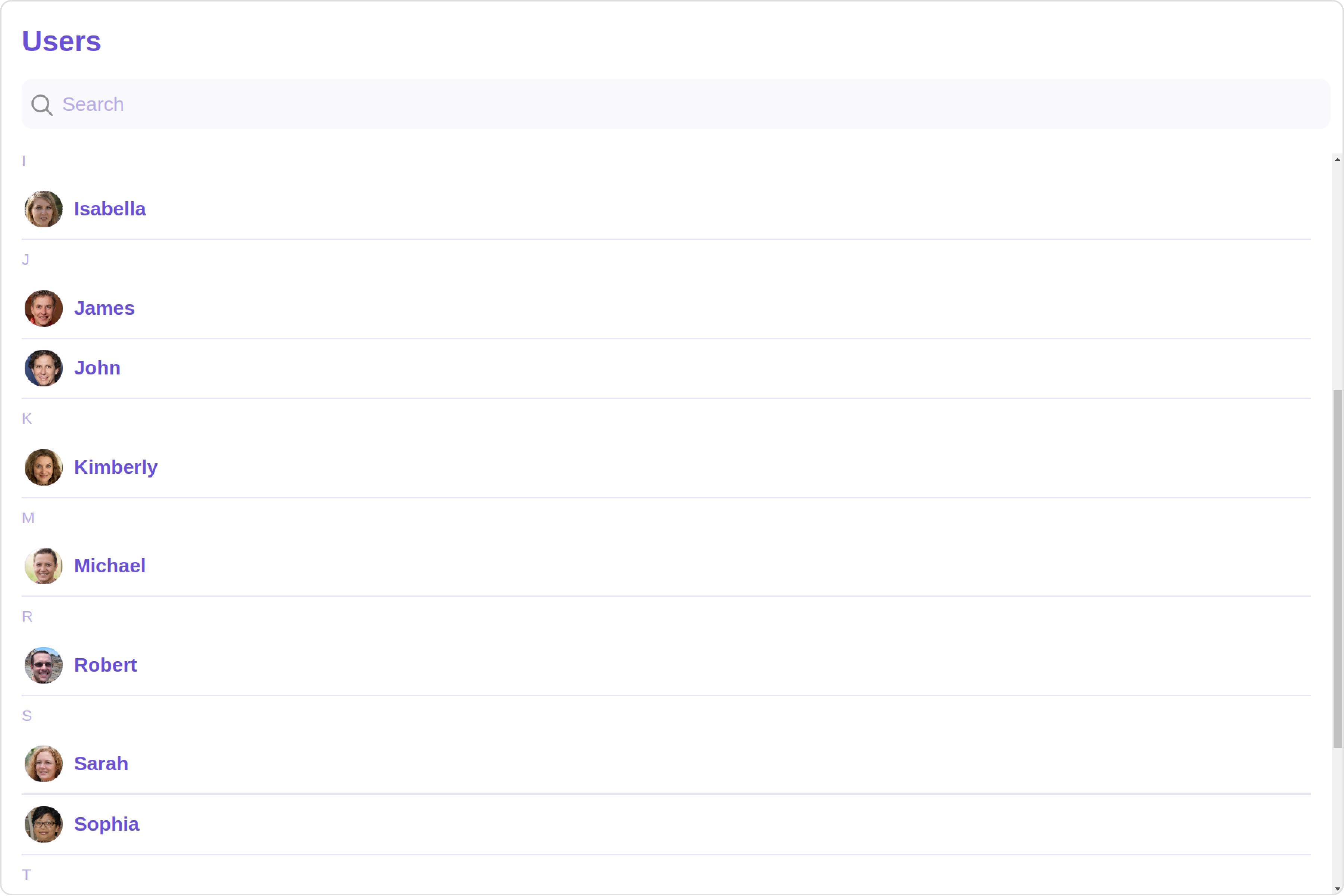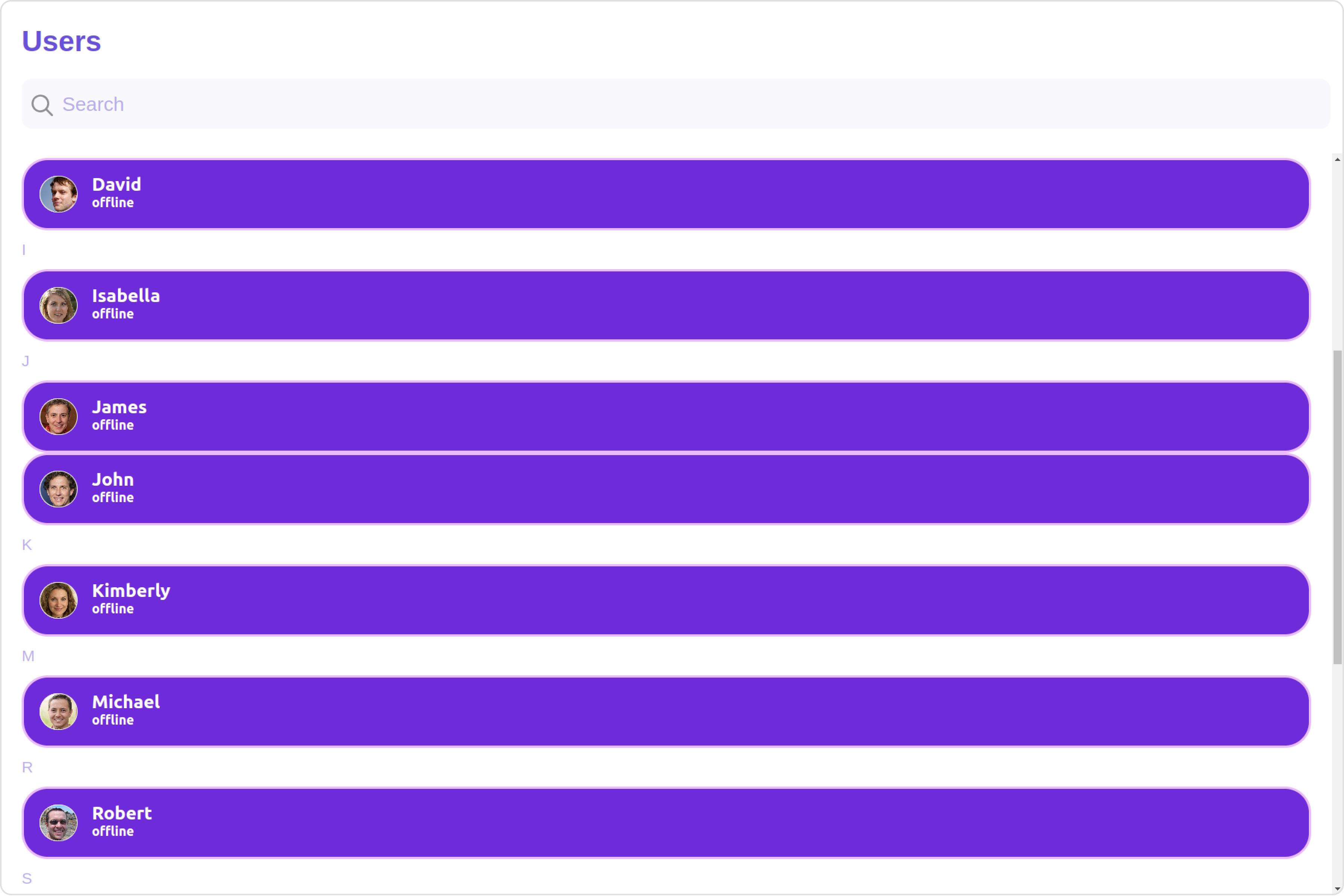 The Users is a Component, showcasing an accessible list of all available users. It provides an integral search functionality, allowing you to locate any specific user swiftly and easily. For each user listed, the widget displays the user’s name by default, in conjunction with their avatar when available. Furthermore, it includes a status indicator, visually informing you whether a user is currently online or offline.