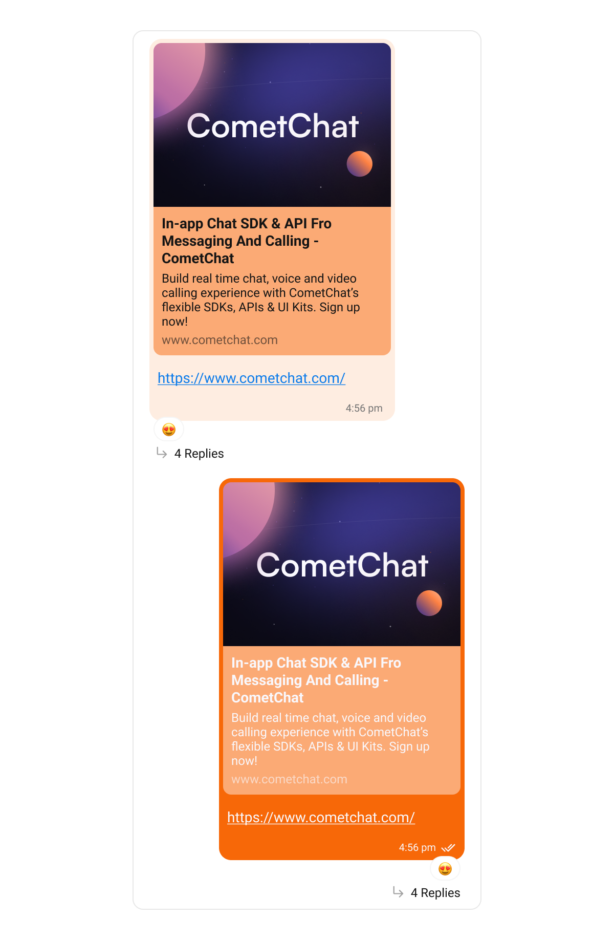 CometChatOutgoingMessageBubbleStyleandCometChatIncomingMessageBubbleStyleobjects to theoutgoingMessageBubbleStyleandincomingMessageBubbleStyleproperties of the CometChatMessageListStyle class.