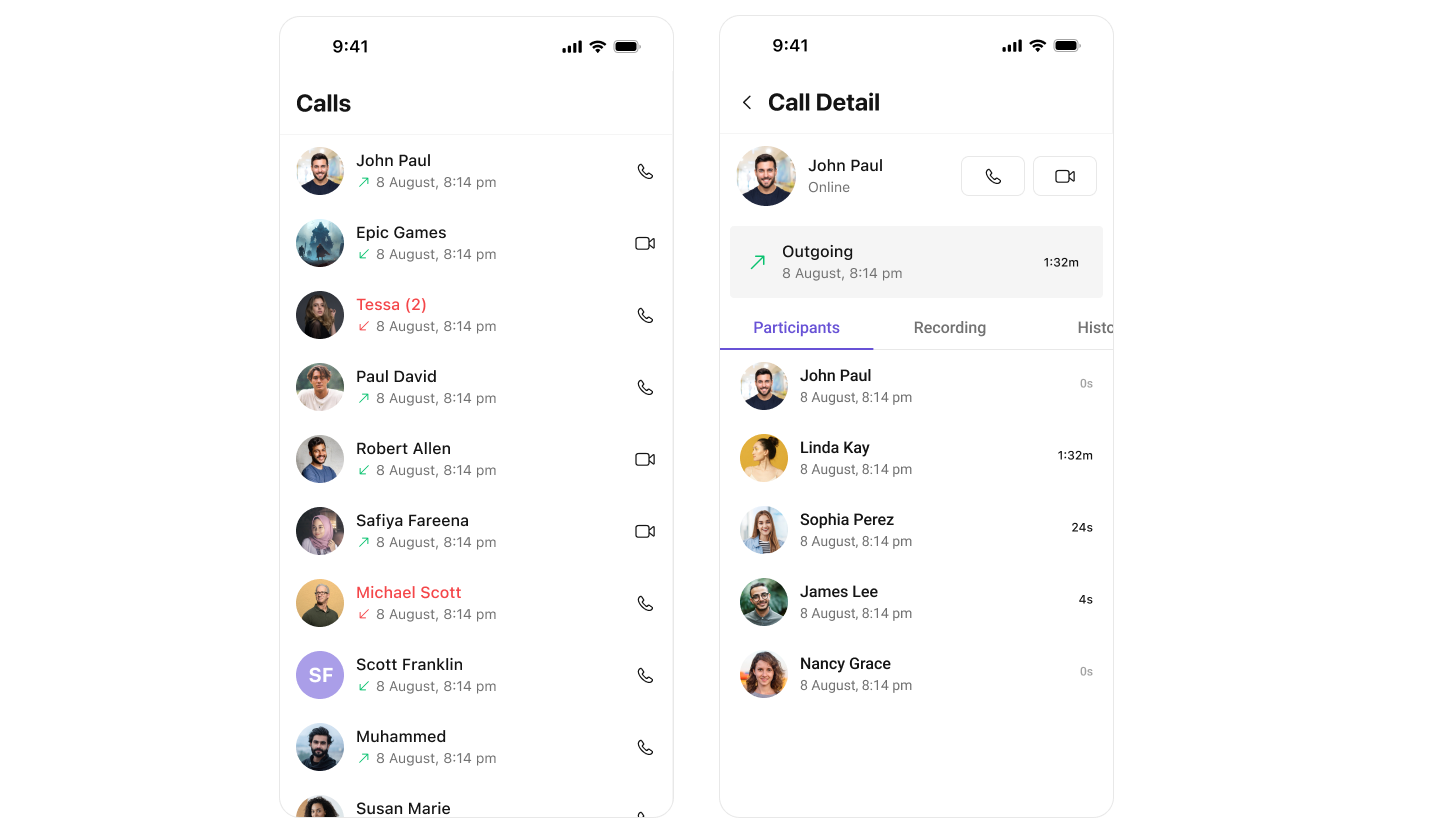 Call Logs component provides you with the records call events such as who called who, the time of the call, and the duration of the call. This information can be fetched from the CometChat server and displayed in a structured format for users to view their past call activities.